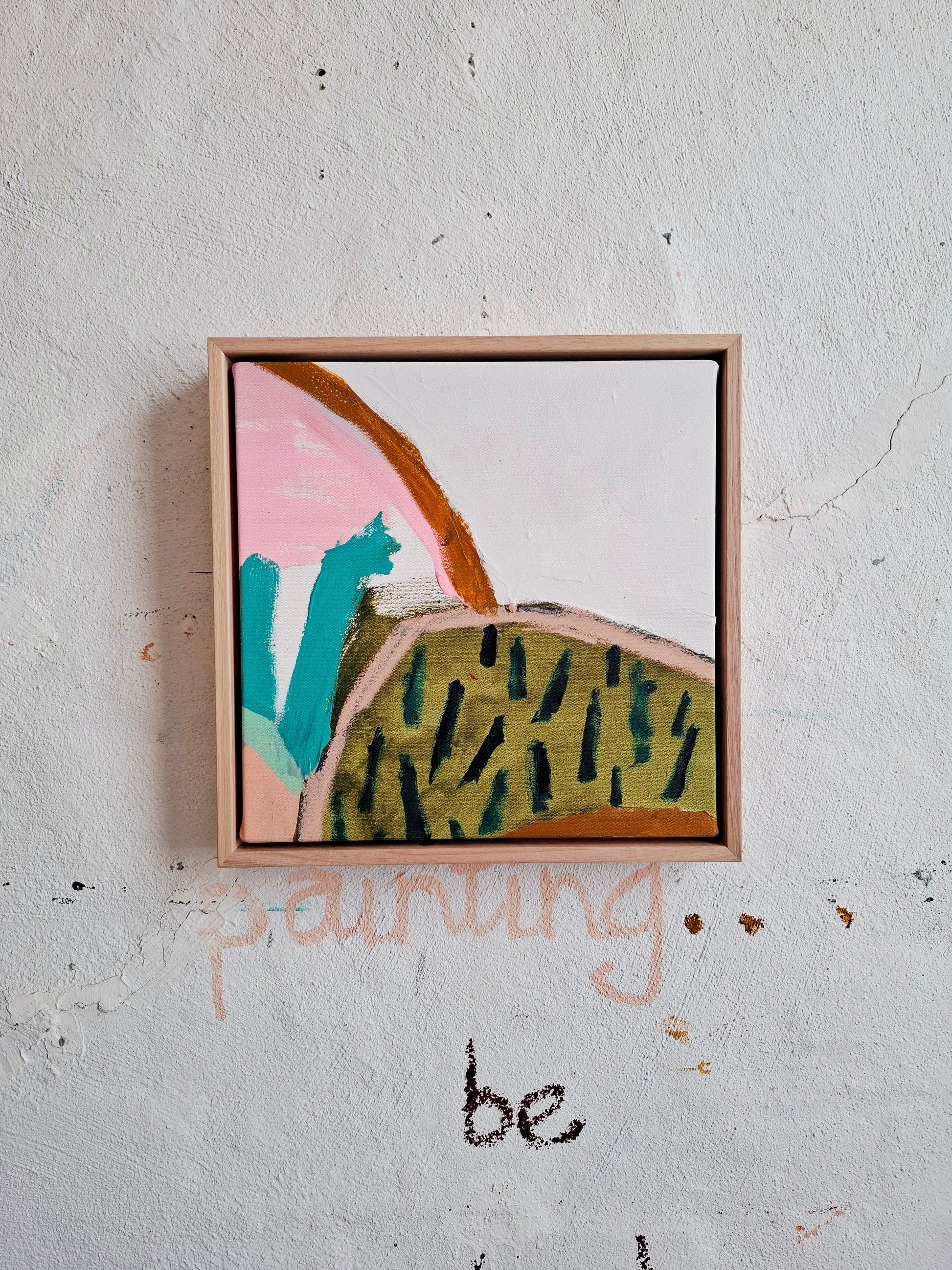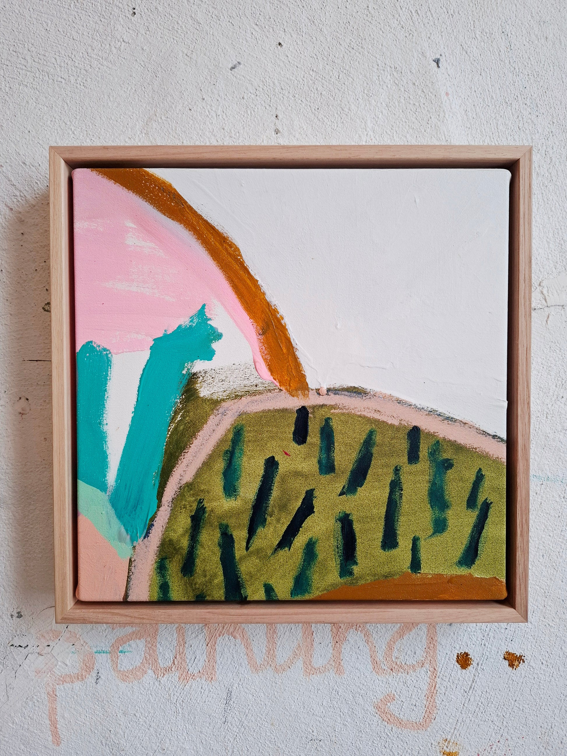 This is a smaller abstract original painting that is framed in an Oak floating timber frame.