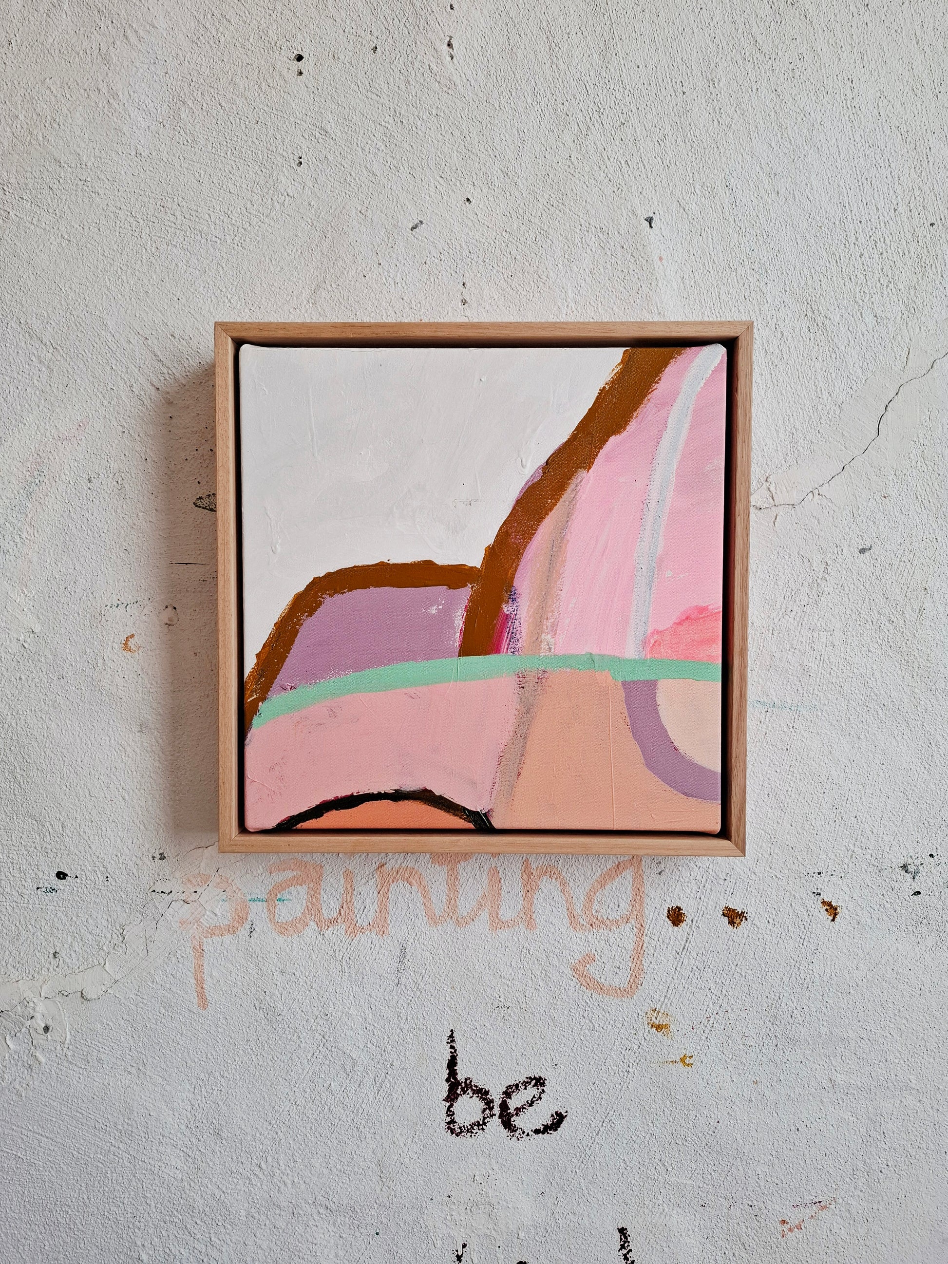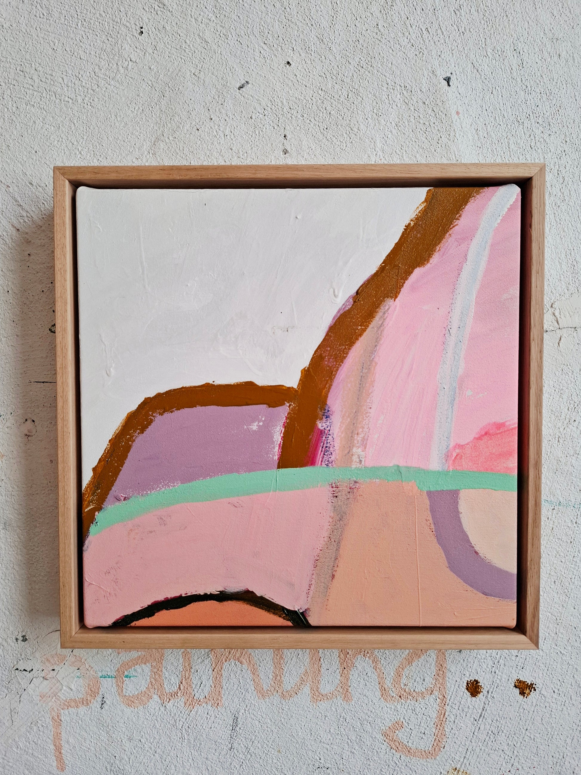 This is a smaller abstract original painting that is framed in an Oak floating timber frame.