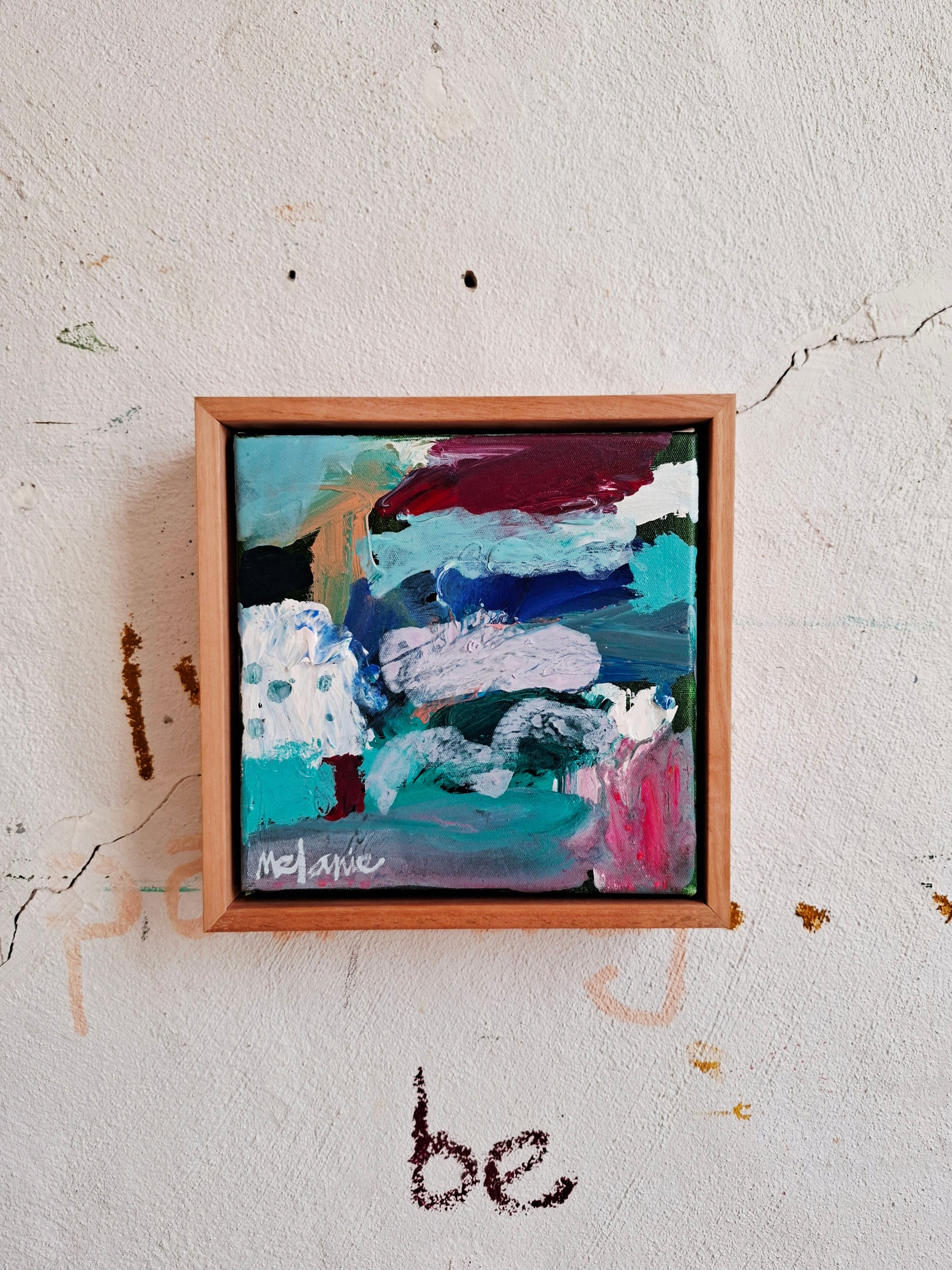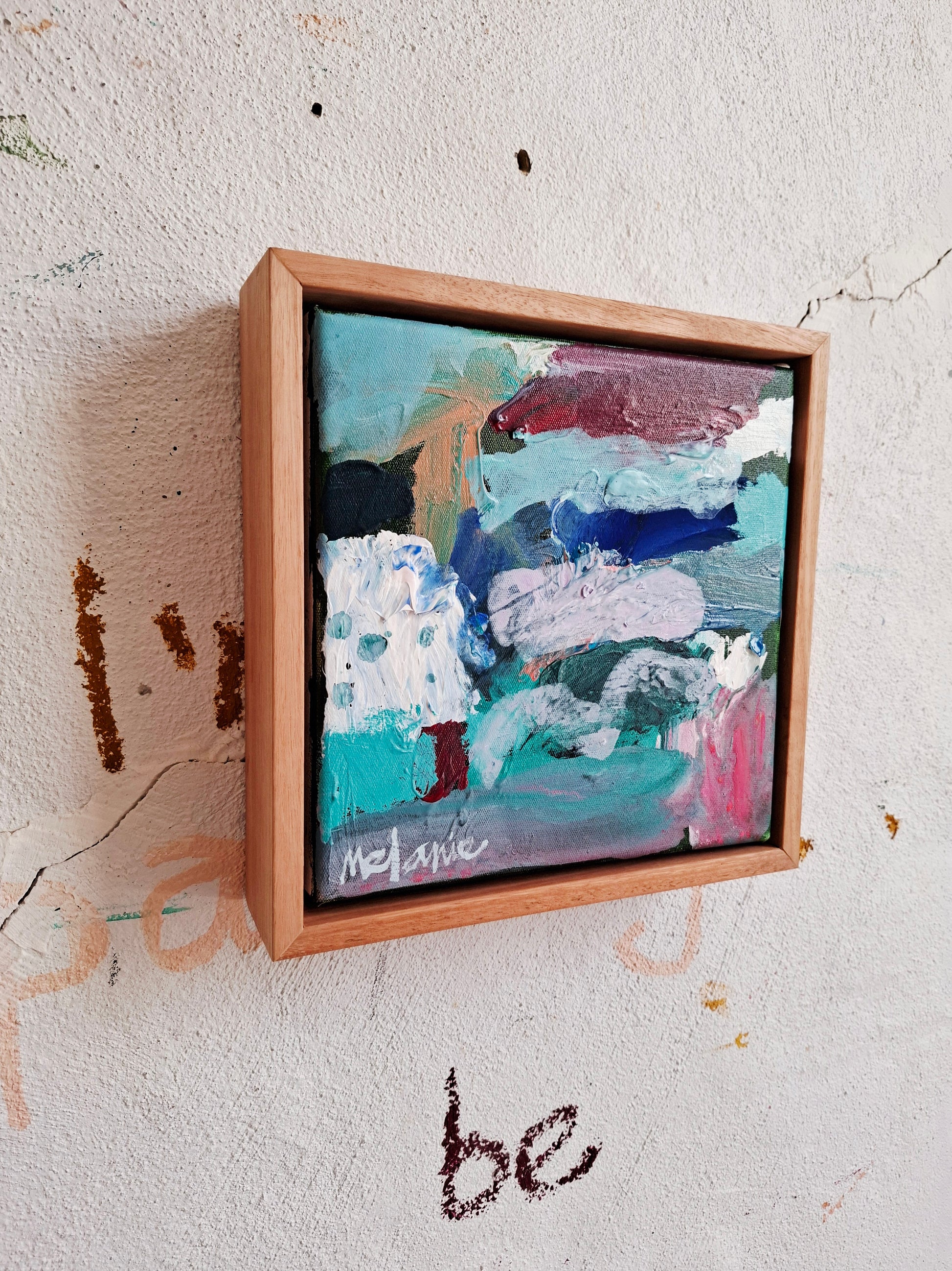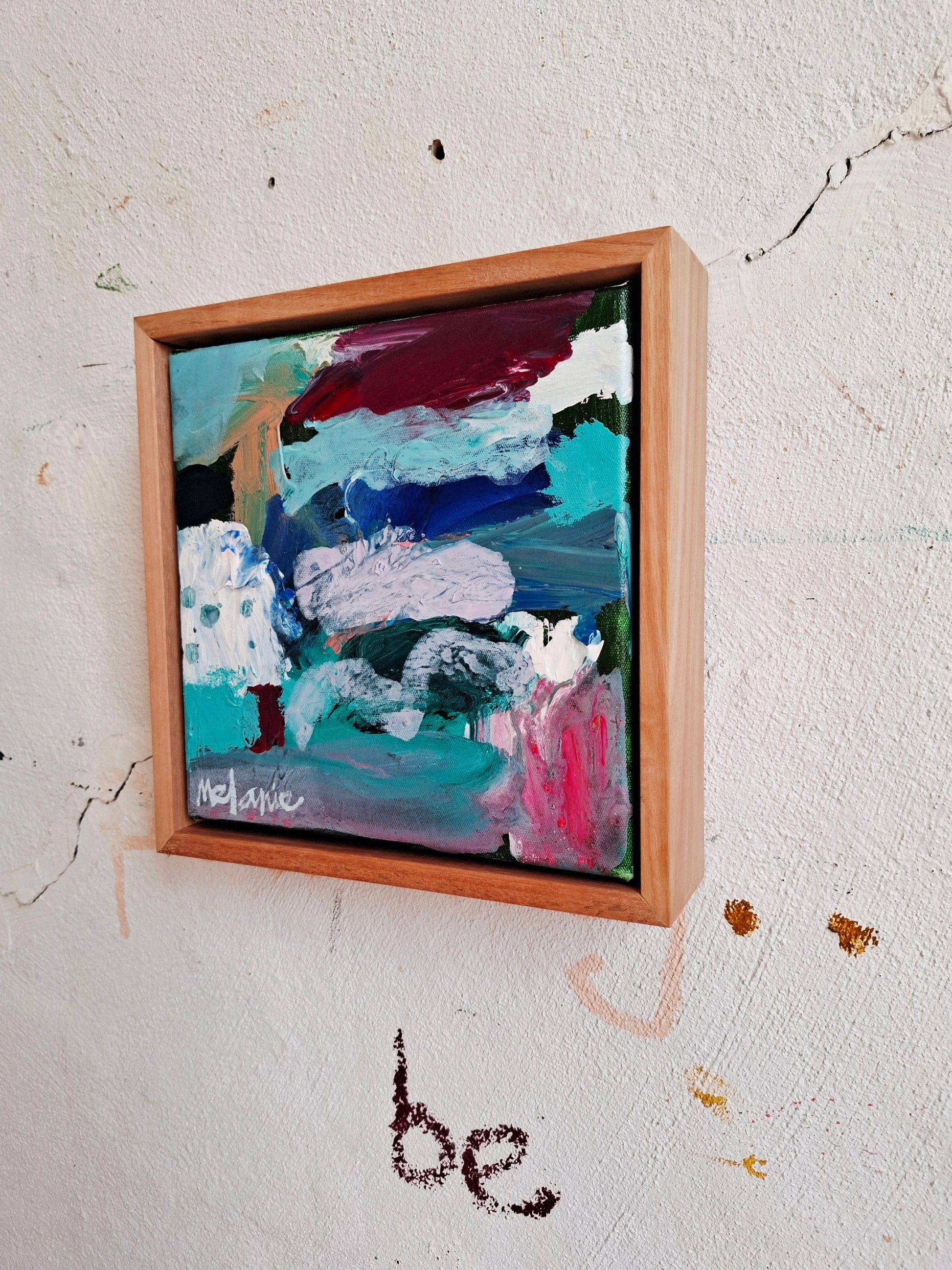 This is a new smaller original painting that is framed in a sustainability sourced flooded gum timber floating frame.